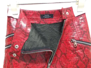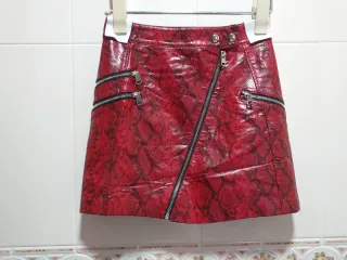 Falda corta con un llamativo estampado efecto piel de serpiente en color rojo. Ideal para darle un look especial en tu día a día. Bershka. Talla 34. - Cierre de cremallera frontal. - Detalle con cremallera. - Botones metálicos.