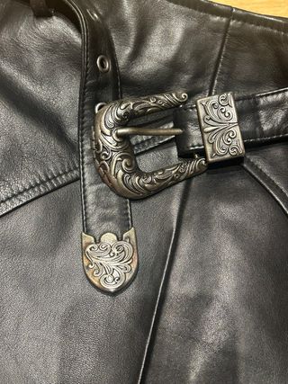 Falda midi de piel negra, un clásico atemporal con un toque vintage. - Diseño midi. - Material: Piel. - Talla: 38. - Hecha en España. * Está en perfecto estado, perdió uno de los cristales que iba en medio de los dos que aparecen. Hago envíos, también se puede recoger en calle Jaime el Conquistador, cerca de los metros Legazpi y Delicias (28045).
