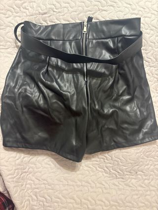 Falda short de efecto piel con cinturón. - Diseño moderno y elegante. - Cinturón a juego incluido. - Cremallera frontal.