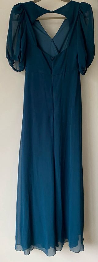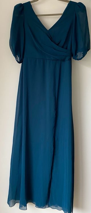 Elegante vestido largo de la marca Veneno en la Piel. - Color verde cerceta/esmeralda. - Diseño cruzado en la parte superior. - Mangas abullonadas. - Falda larga con abertura lateral. - Talla S/36
