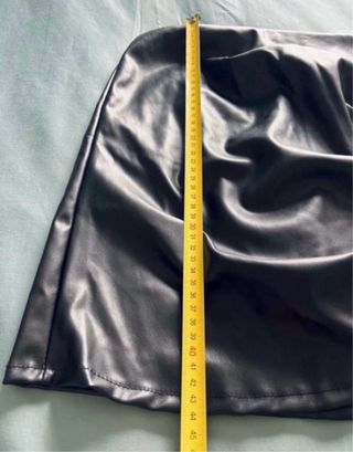 Falda corta de efecto piel con cinturón. Tela tipo cuero sintético negro con forro por dentro Talla S - Diseño con cinturón. - Cierre de cremallera. Mide de cintura 34cm y de largo 43cm