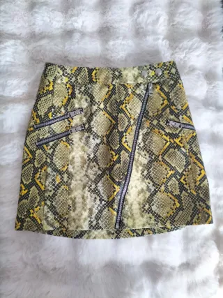 Falda corta con efecto piel y textura de escamas. - Diseño moderno y versátil. - Cierre de cremallera. - Acabado brillante. A estrenar pero con defectos mostrados en las imágenes