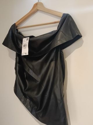 Top efecto piel negro escote bardot asimétrico