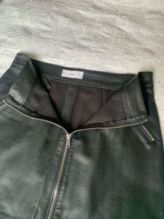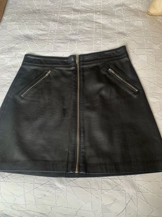 Falda de piel sintética. Puesta una vez. Queda un poco por encima de la rodilla. Abierta un poco por detrás