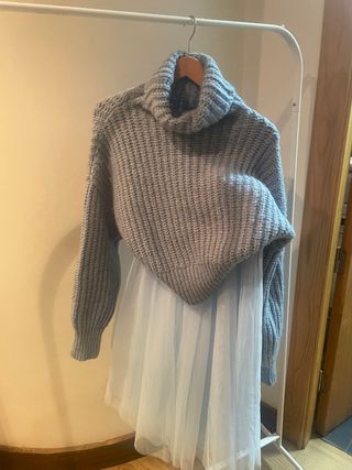 Conjunto muy actual en color azul bebé que combina un jersey de Zara con una falda de tul de H&M. • Jersey de punto grueso con cuello alto, muy suave y calentito. • Falda de tul ligera y vaporosa que aporta movimiento y un toque femenino. • El conjunto en azul bebé crea un look delicado, elegante y muy favorecedor. • Ambas prendas en muy buen estado. Ideal para llevar con botas, mocasines o zapatillas y también para combinar cada prenda por separado.