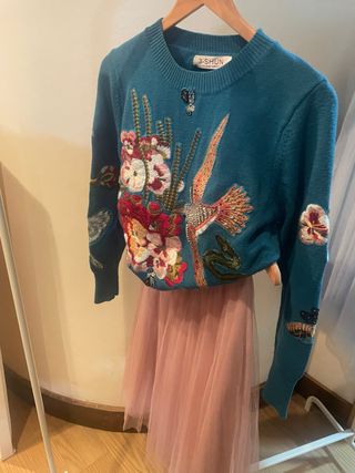 Conjunto muy especial formado por jersey bordado de 3-SHUN y falda de tul rosa. Inspirado en los icónicos bordados del estilo Gucci vintage. • Jersey azul petróleo con espectaculares bordados de flores, pájaros y serpiente, también en la espalda. • Detalles de bordado y pedrería muy trabajados que lo hacen una pieza única. • Falda de tul rosa empolvado, ligera y con mucho movimiento. • Look muy femenino y original, perfecto con botas, bailarinas o zapatillas. • Ambas prendas en excelente estado.