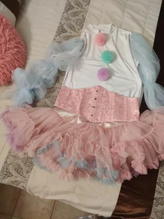 Conjunto de disfraz de payasa con un diseño divertido y colorido. - Top blanco con mangas abullonadas de tul azul. - Corsé rosa con detalles. - Falda de tul en capas con volantes rosas y detalles azules y morados. - Tres pompones decorativos (rosa, verde menta, lila) - Accesorios varios (globo de regalo)