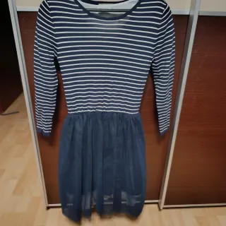 Vestido con cuerpo de rayas y falda de tul. - Cuerpo de rayas blancas y azul marino. - Falda de tul azul con vuelo. - Cintura elástica.