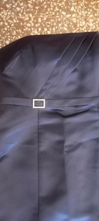 Vestido de ceremonia azul marino .talle debajo el pecho escote palabra de honor ,entallado asta la cadera y más abierto con doble falda de tul en la parte baja.