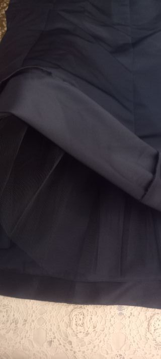 Falda corta azul con vuelo, de tul y reflejos plateados, nueva sin estrenar, tiene forro.No conserva la etiqueta.