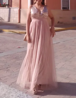 Elegante vestido largo de fiesta, perfecto para bodas y eventos especiales. Su diseño con lentejuelas añade un toque de brillo. - Diseño del cuerpo con lentejuelas. La falda con tul. - Largo hasta el suelo. - Escote barco con escote discreto en la espalda. Precio negociable. Comprado por 300€ en tienda outlet (precio original 500). Solo tiene 3 puestas
