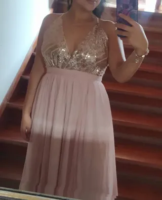 Vestido por la rodilla de color rosa y malva con lentejuelas multicolor. Impecable de todo, lentejuelas perfectas - Diseño elegante y sofisticado. - Lentejuelas brillantes. - Falda de tul vaporosa y ligera.Es un modelo que nadie llevará a un evento, cortamos la etiqueta y no recuerdo la marca,se compro en tienda de invitada de boda, Ancho cazuela pecho 17, debajo pecho 38, cintura 40 , cadera 45, largo desde escote 72 medida la gasa,las medidas del cuerpo son del vestido de abajo la gasa es más ancha.En Valencia o Madrid te lo enseño sin compromiso,si estás interesada escribeme,es muy original!!No lo llevará nadie....