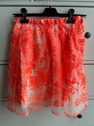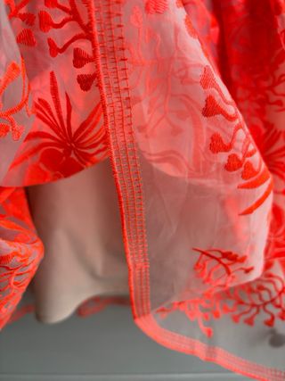 Falda corta de tul con bordados florales en color naranja vibrante. La cintura es elástica y fruncida para un ajuste cómodo. - Diseño de tul semitransparente con forro beige - Bordados detallados de motivos florales y botánicos. - Cintura elástica con fruncido. - puesta en 2 bodas - talla 1 Maje (36, S)