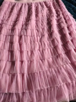 Vestido de tul en tono rosa, ideal para eventos especiales. Su diseño strapless con reborde silicona para que no se resbale y la falda vaporosa lo hacen muy elegante. Femenino y elegante Vestido completo forrado Medidas axila 40 cm largo 67 cm - Cuerpo del vestido con detalles. - Falda de tul con varias capas. - Largo hasta la rodilla.