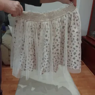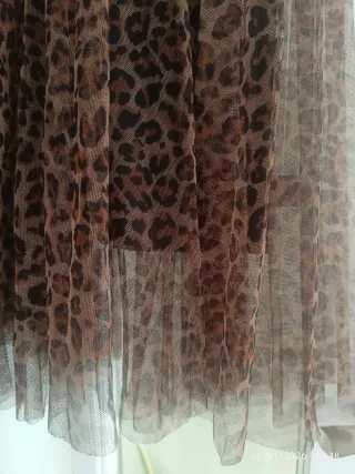 Falda de tul con estampado de leopardo y detalles brillantes en la cintura, talla 14 pero valdría para 15 también porque se ensancha. 48 cm de ancho 40 cm de largo - Diseño de leopardo. - Cintura con banda brillante. - Tejido de tul.