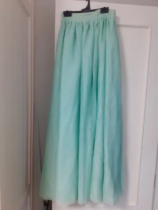 Falda larga de tul en un bonito color verde agua. Es vaporosa y tiene un corte amplio que le da mucho movimiento. - Cintura elástica. - Tejido ligero y vaporoso. - Largo hasta los tobillos.
