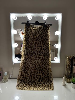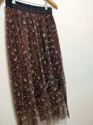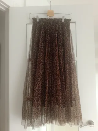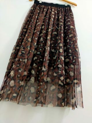 Falda larga de tul con un llamativo estampado de animal print. Puesta solo una vez. Con forro hasta la rodilla