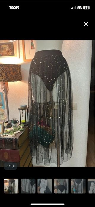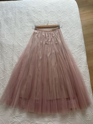 Elegante falda larga de tul con un brillo sutil. - Diseño de doble capa. - Cintura elástica para mayor comodidad. - Tejido ligero y vaporoso.