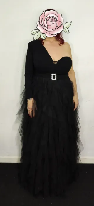 Elegante vestido largo negro con detalle de tul. - Diseño asimétrico con un hombro. - Falda voluminosa de tul en capas. - Cinturón con hebilla adornada. Usado 1 sola vez para un desfile