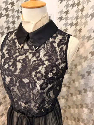 Elegante vestido largo con detalles de encaje y tul. - Cuerpo de encaje floral. - Cintura con cordón ajustable. - Falda de tul semitransparente. - Cuello camisero.