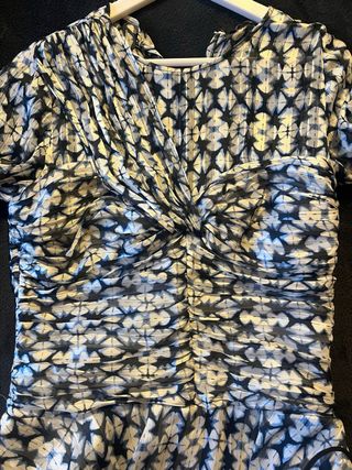 Vestido largo de tul con estampado de cuadros y detalle drapeado en la cintura. El bajo es asimétrico. Zara. Talla S. - Mangas largas de tul - Diseño fluido. - Con forro en cuerpo y falda. Escote en V en la espalda y lazada. Sin estrenar, con etiqueta, en perfecto estado.