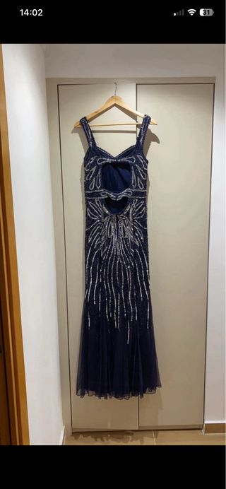 Elegante vestido largo con detalles de lentejuelas plateadas sobre fondo azul marino. Perfecto para eventos especiales. - Diseño con tirantes. - Cuerpo adornado con motivos de lentejuelas. - Falda larga con caída. - Acabado con tul en la parte inferior.