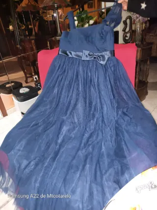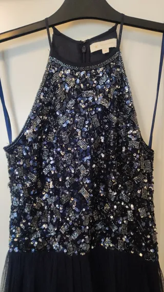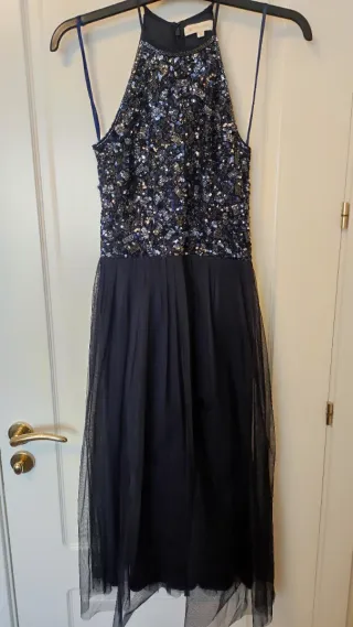 Elegante vestido largo azul noche, perfecto para eventos especiales. Combina un corpiño de lentejuelas brillantes con una falda vaporosa de tul. - Corpiño adornado con lentejuelas plateadas y azules. - Falda larga de tul en tono azul marino. - Diseño de cuello halter. - Talla S: largo desde los tirantes hasta el final del tul son 1,23 m. Ancho cintura 35 cm. Ancho axilas 38 cm. - Exterior 100% nailon, forro 100% poliéster.