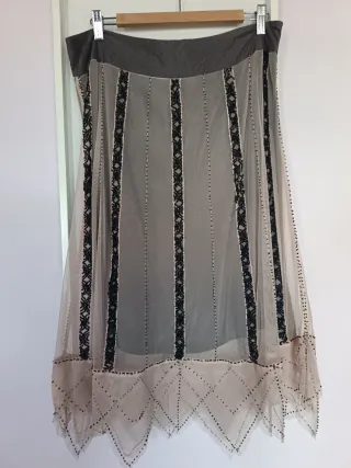 Preciosa falda larga con detalles de pedrería. - Tejido de tul ligero. - Diseño con tiras verticales y detalles de pedrería negra. - Bajo con forma de picos y rombos bordados. - Cintura con banda de tela gris. Impecable para una ocasión y una mujer muy especial
