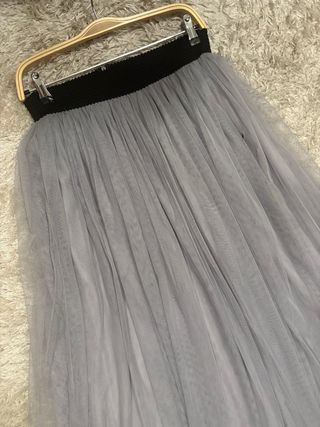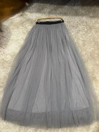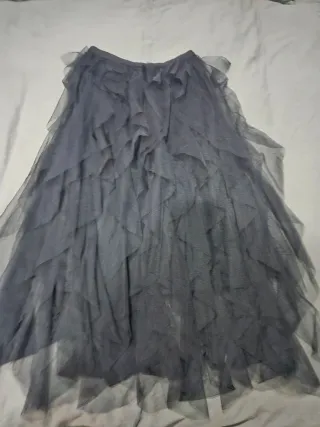 Falda larga de tul gris con múltiples volantes. Solo se ha puesto dos veces, está como nueva. - Talla única. La cintura mide 34cm pero al ser de goma...da hasta una XL + Diseño de volantes en cascada. - Tejido ligero y vaporoso.