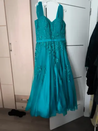 Elegante vestido largo de tul en color verde. Perfecto para eventos especiales. - Diseño de un solo hombro. - Cintura marcada con fajín. - Falda vaporosa y fluida. - copas de sujetador cosidas por dentro Puesto en una sola ocasión