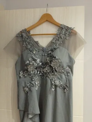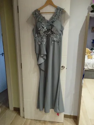 Elegante vestido de fiesta largo. - Diseño con escote en V y detalles de lentejuelas y guipur - Mangas cortas de tul. - Falda con aplique lateral y corte sirena. Talla XXL equivalente a 48-50.