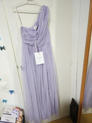 Vestido largo de gasa, ideal para bodas y eventos especiales. Talla 42/44. - Diseño elegante de un solo hombro. - Cinturón de satén con lazo. - Falda vaporosa de tul.