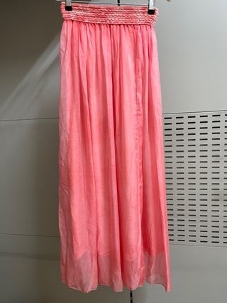Falda larga de tul con cintura elástica. - Diseño vaporoso y ligero. - Cintura fruncida con detalle. - Largo hasta los tobillos. - Tiene el forro un poco roto en un lateral como se observa en una de las fotos. - Algún fallo en el tul que casi no se percibe ( fotos aumentadas para que se viera).