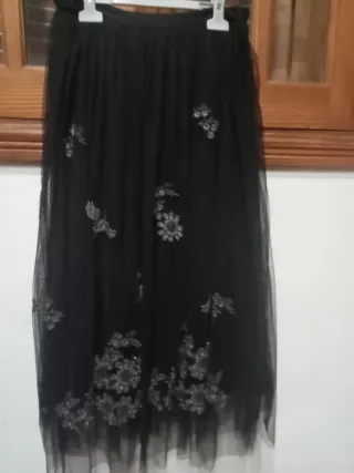 Falda larga de tul negra con delicados bordados plateados. - Diseño con vuelo. - Detalle de bordados florales y aves. - Cintura elástica.