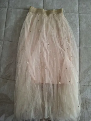 Elegante falda larga de tul con un diseño de capas y detalles de perlas. - Tejido de tul ligero. - Adornada con pequeñas perlas. - Diseño de capas asimétricas. - Cintura elástica para mayor comodidad.