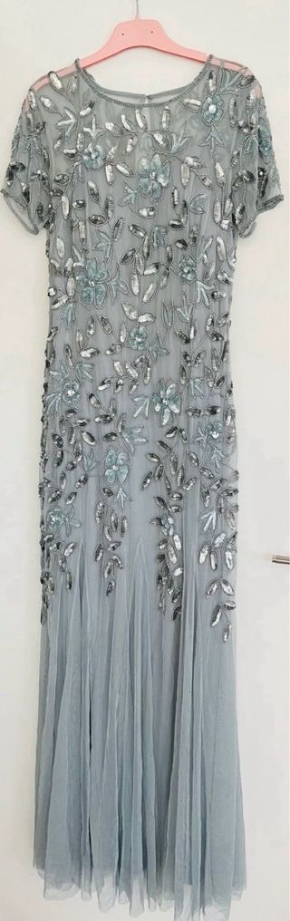 Elegante vestido largo con detalles de pedrería. Talla L crazy London - Diseño con pedrería plateada y flores. - Falda con vuelo de tul. - Manga corta.