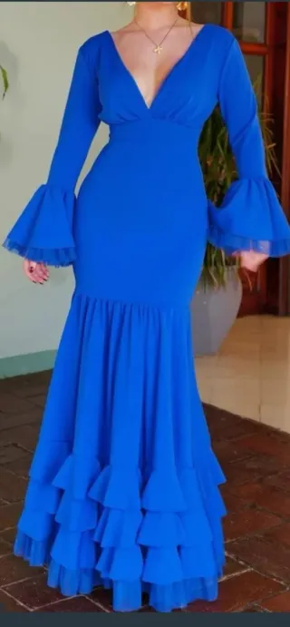Elegante vestido de flamenca con un diseño vibrante y detalles llamativos. - Mangas largas acampanadas con volantes. - Falda larga con múltiples volantes escalonados. - Escote pronunciado en V.