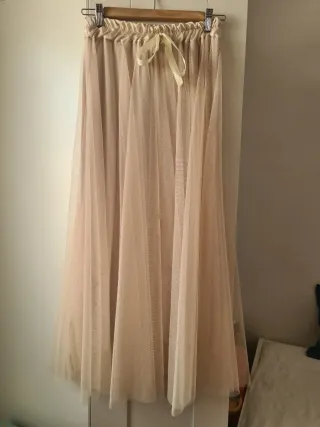 Elegante falda larga de tul en color beige. Tiene una cinturilla elástica con un lazo decorativo.