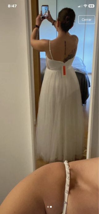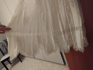Descripción: Precioso vestido midi de la marca TFNC en color blanco con lunares negros (polka dots), ideal para eventos, bodas, graduaciones o un look de invitada con aire retro/vintage. Estilo/corte: Escote en V cruzado muy favorecedor, cuerpo ajustado con banda en la cintura y falda de vuelo con doble capa de tul que aporta volumen. Tirantes anchos y cierre de cremallera invisible. Talla: 44 (equivale a una L/XL según la marca). Medidas aprox.: * Largo total: 110 cm Sisa a sisa (pecho): 48-50 cm Cintura: 42 cm Estado: Muy buen estado. Usado solo en una ocasión para una ceremonia. Sin manchas, enganches en el tul ni rotos.