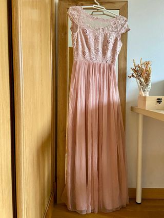 Elegante vestido largo en tono pastel, perfecto para eventos especiales. Forrado. Presenta un delicado encaje en la parte superior y una falda vaporosa. - Cuerpo de encaje con detalles florales. - Mangas cortas de encaje. - Escote ilusión. - Falda larga de tul.