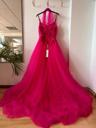 Elegante vestido de gala en color rosa vibrante. Diseñado con tirantes finos y un corpiño adornado con delicados detalles de encaje y pedrería. - Cuerpo superior con aplicaciones de encaje. - Falda voluminosa de tul. - Diseño con escote en V.