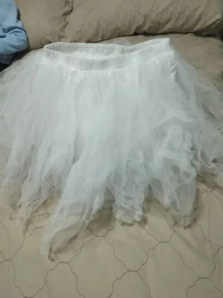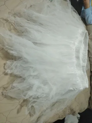 Falda de tul blanca en talla XS, nueva. La cintura mide 28 x 2 cm y es completamente elástica, por lo que se adapta bien. Tiene un largo de entre 84 y 85 cm, y el forro interior mide 75 cm. Está compuesta por 4 capas: 3 de tul y 1 de forro. La capa más interna del tul tiene un diseño fruncido, lo que le da un volumen especial y un peso superior al de una falda de tul normal. (ver foto 4-5)Por eso, no es una falda de tul cualquiera: tiene mucha más presencia y cuerpo. Comprada por 40€, la vendo porque no he tenido ocasión de usarla.