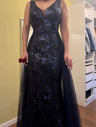 Elegante vestido largo azul noche, perfecto para eventos especiales. Combina un corpiño de lentejuelas brillantes con una falda vaporosa de tul. - Corpiño adornado con lentejuelas plateadas y azules. - Falda larga de tul en tono azul marino. - Diseño de cuello halter. - Talla S: largo desde los tirantes hasta el final del tul son 1,23 m. Ancho cintura 35 cm. Ancho axilas 38 cm. - Exterior 100% nailon, forro 100% poliéster.