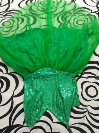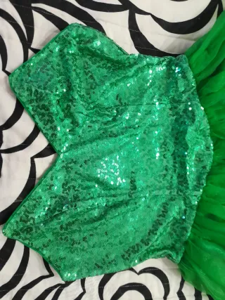 Este vestido de hada es de un vibrante color verde y tiene un diseño encantador. - Parte superior con lentejuelas brillantes. - Falda de tul con detalles florales. - Diseño de cola de pez en la parte inferior.