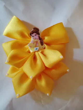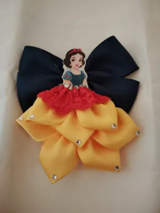 Adorno para el pelo con diseño de las princesas Disney. - Lazo grande azul marino. - Falda de tul roja. - Base con pétalos amarillos. - Detalles de pedrería.