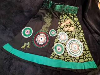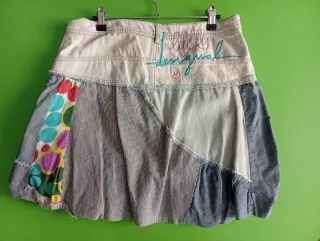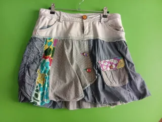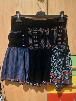 Falda de la marca Desigual con un diseño vibrante y original. Talla 38, buen estado - Combinación de estampados y texturas. - Detalle de bordados en la parte superior. - Varios paneles con diferentes diseños. - Bolsillos decorativos.