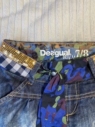 Falda vaquera de la marca Desigual con un diseño único. - Cintura con detalle de lentejuelas doradas. - Estampado floral y de camuflaje en el interior y lazo. - Cierre de botón y cremallera.