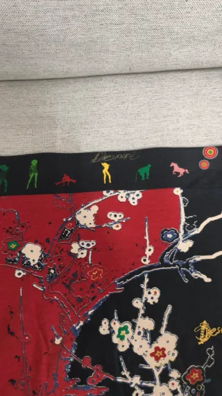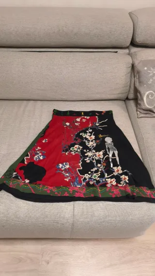 Falda midi con un diseño vibrante y original de Desigual. En buenas condiciones, sin desperfectos ni manchas Muy poco uso, solo 2 o 3 veces Talla M - Estampado floral y de aves. - Combinación de colores rojo, negro y verde. - Corte acampanado.