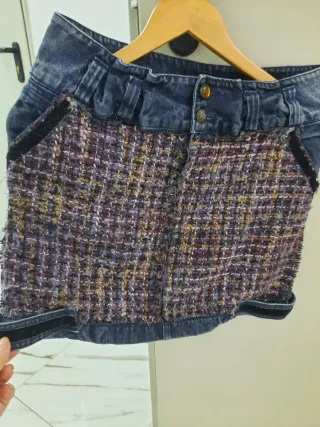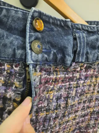 Falda de la marca Desigual con un diseño único. - Combinación de tejido vaquero y tweed. - Detalle de cinturilla con trabillas. - Cierre de botones en la parte frontal.