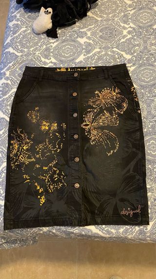 Falda vaquera de la marca Desigual con un diseño llamativo. - Estampado floral en tonos dorados y oscuros. - Corte recto. - Tejido denim. - Cintura 44cm - Largo 65 cm